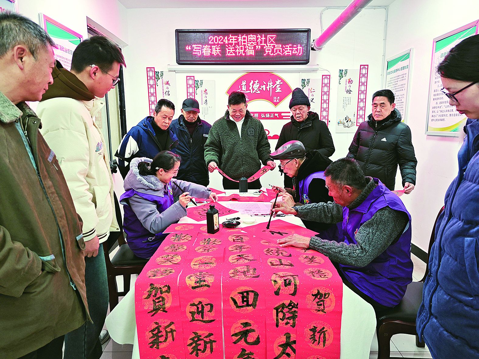 近日,緯四街道柏奧社區(qū)黨委第二黨支部開展“寫春聯(lián) 送祝福”黨員活動(dòng)。熟練的筆法寫出一幅幅精美的春聯(lián),手中的畫筆畫出一張張?jiān)溨C有趣的龍年“福”字,引得過往黨員群眾駐足觀賞。