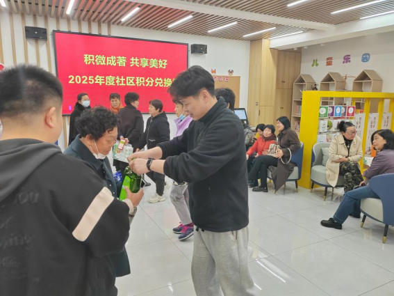 綠地花都社區“積微成著 共享美好 社區積分嘉年華”積分兌換季活動現場,社區居民拿著公益積分進行積分兌換,按照“一分抵一元”的標準,認真挑選自己心儀的物品。積分超市里,除了有抽紙、肥皂、牙膏等生活物品,還有米、油等助農產品一應俱全,不同物品標注著不同的積分。居民們通過參與志愿服務、社區治理等活動獲得積分,積累到一定額度可以在積分超市兌換各類物品及周邊商家服務。