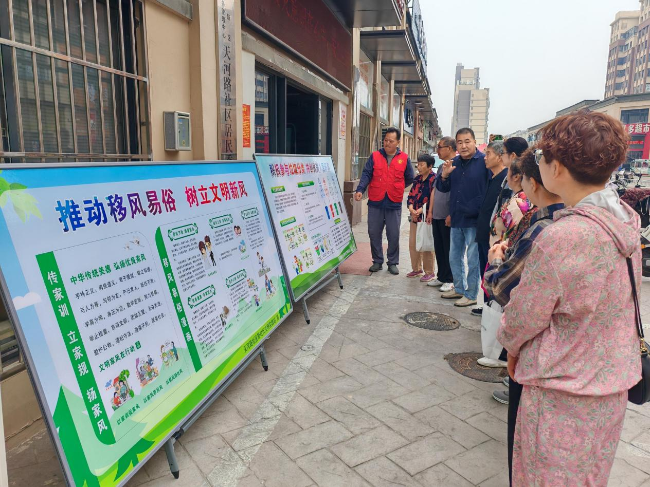 培育新風,吹拂文明天河。天河路社區深入踐行社會主義核心價值觀,豐盈文明沃土,培育文明之花。社區堅持開展移風易俗活動,通過觀看展板、宣傳片的方式引導轄區群眾摒棄陳規陋習,做文明進步好居民。以婦女節、母親節等節日為契機,社區有針對性地宣傳抵制天價彩禮,提倡文明婚嫁,培育良好家風。另外,社區每月開展好人事跡宣講,擴大文明典范的影響力與覆蓋面,在轄區居民間弘揚良好美德。
