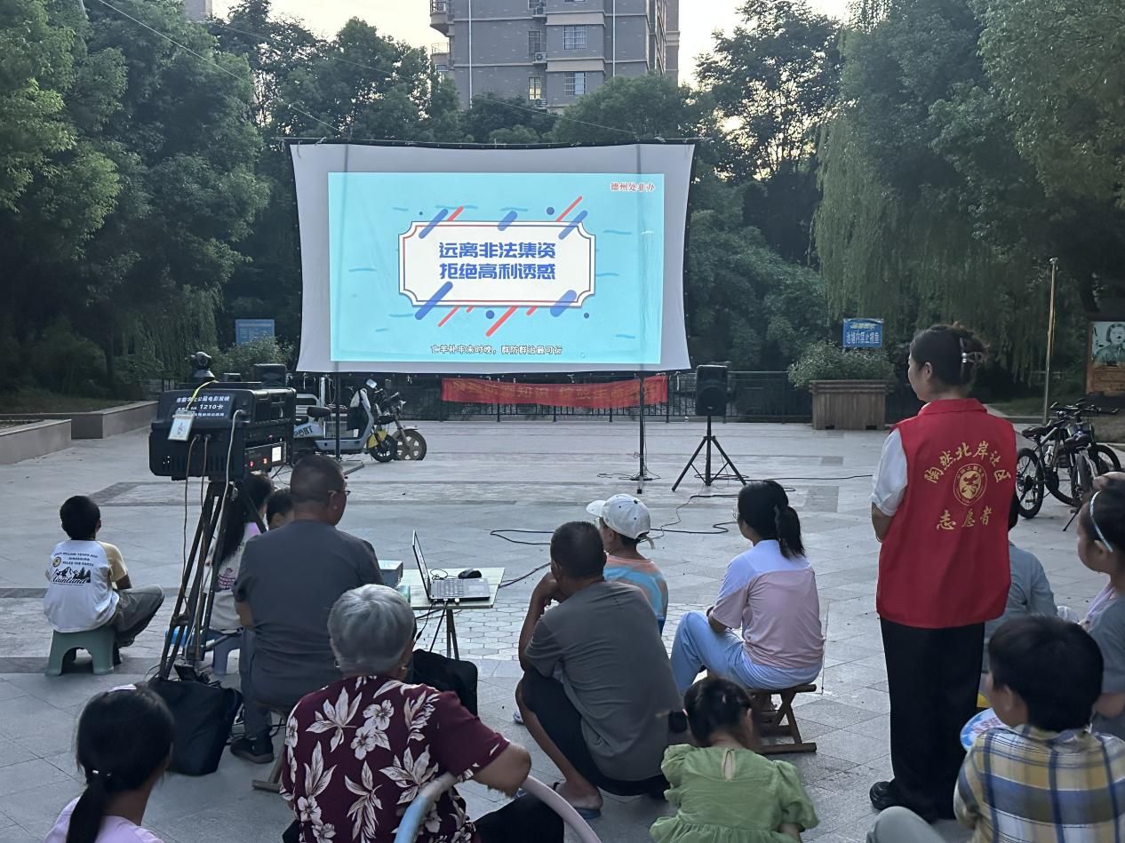 傍晚7時,社區廣場燈光亮起,公益電影放映環節正式開啟,熱門動畫電影《熊出沒:重啟未來》吸引了近百組家庭駐足觀看。在電影放映前與中場休息時段,屏幕滾動播放 2 分鐘防非宣傳短片,同步閃現“遠離非法集資,守護家庭幸福”“高息誘惑是陷阱,保本承諾不可信”等醒目標語,將防非知識融入親子觀影的休閑時光?!耙贿吪愫⒆涌磩赢?,一邊還能學防騙知識,這種形式很貼心!”居民王先生說。