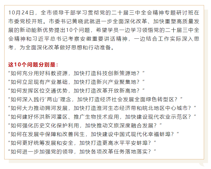 黃曉武在講話中指出,黨的十八大以來,習近平總書記著眼中華民族偉大復興戰略全局和世界百年未有之大變局,親自領導、親自部署、親自推動全面深化改革工作,科學總結歷史經驗,深刻把握改革規律,創造性提出一系列新思想、新觀點、新論斷。黨的二十屆三中全會緊緊圍繞推進中國式現代化這個主題,明確了進一步全面深化改革的指導思想、總目標、重大原則、重大舉措和根本保證,為繼續把改革推向深入提供了思想武器和行動指南。特別是時隔4年,習近平總書記再次來到安徽考察,發表了一系列重要講話,全方位把脈定向,系統性科學指導,為奮力譜寫中國式現代化安徽篇章指明了前進方向、提供了根本遵循。我們要深入學習貫徹黨的二十屆三中全會精神和習近平總書記考察安徽重要講話精神,認真貫徹落實省委十一屆七次全會和市委十二屆七次全會精神,把堅定擁護“兩個確立”、堅決做到“兩個維護”轉化為進一步全面深化改革的戰略定力和行動自覺,為建設中國式現代化幸福蚌埠貢獻更大力量。