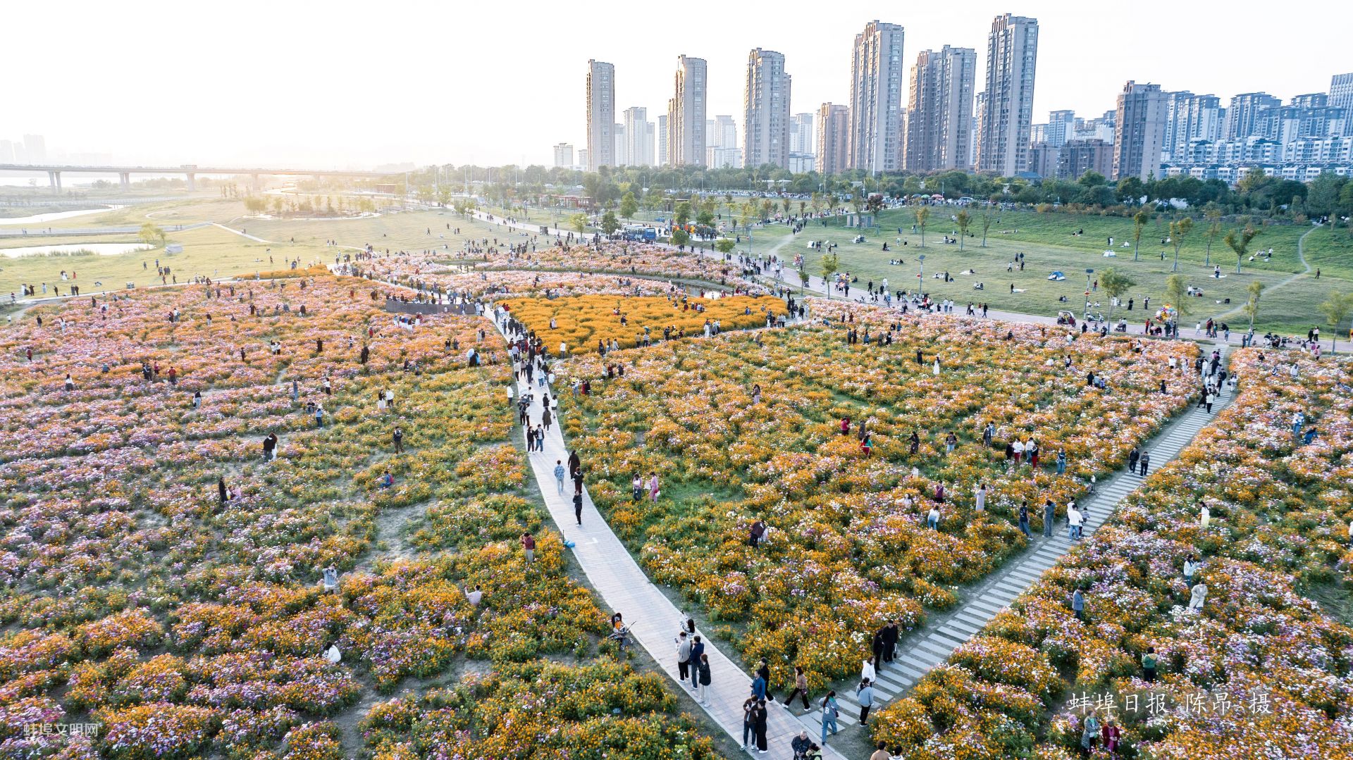 “靚淮河”花海五彩斑斕,人流如織。