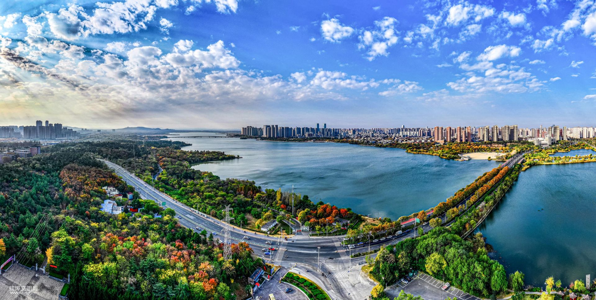 冬日的龍子湖景色宜人,天空湛藍,白云悠悠,陽光灑在湖面上,泛著粼粼波光,岸邊紅黃綠相互交織,盡顯自然與城市的和諧之美。