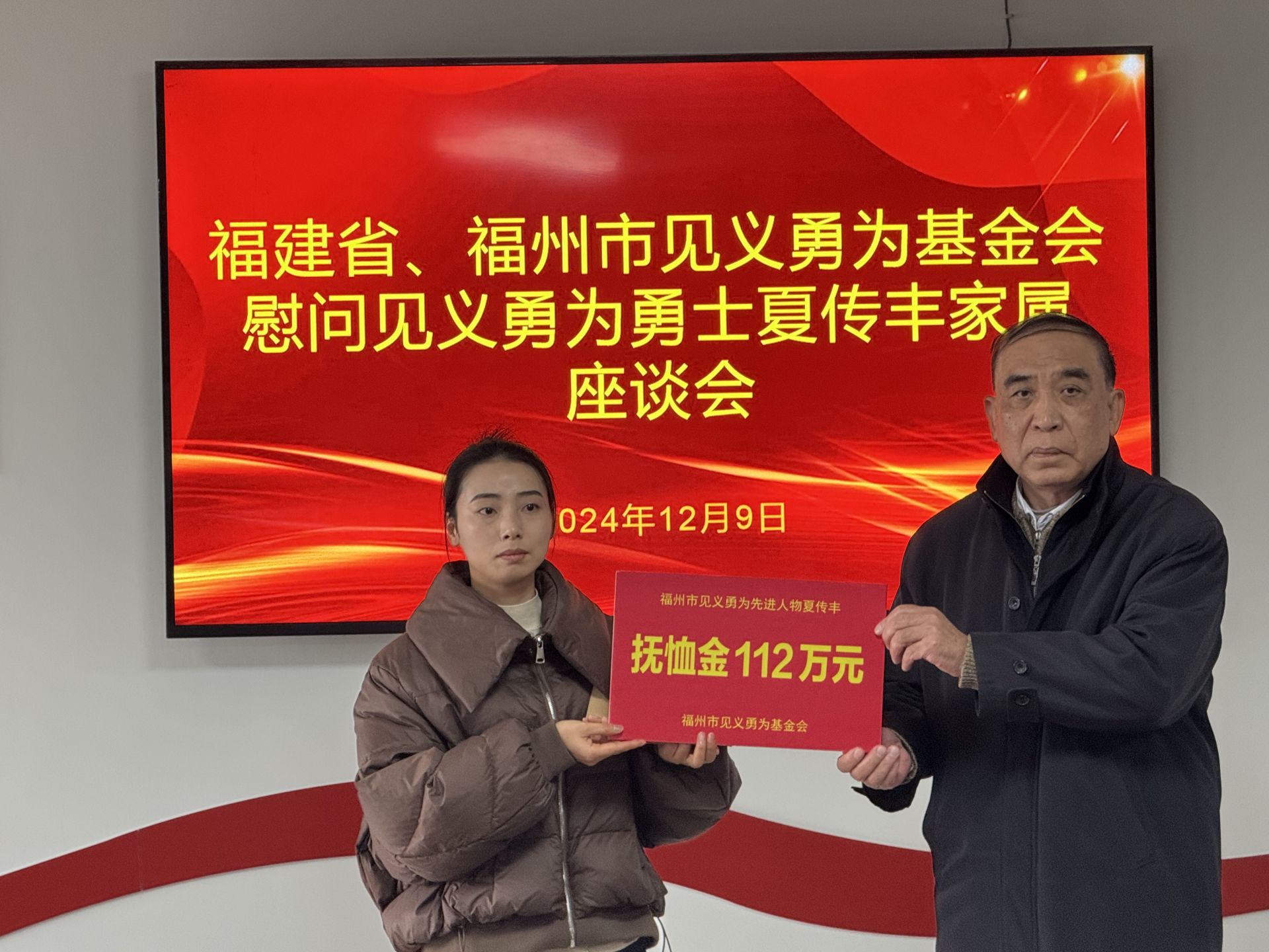 11月29日,福州市召開表彰大會,授予夏傳豐同志見義勇為“卓越獎”,頒發獎勵金10萬元。福州市委、市政府主要負責人親切會見夏傳豐親屬,對他舍己救人的見義勇為精神給予充分肯定、大力贊揚,并頒發撫恤金112萬元。