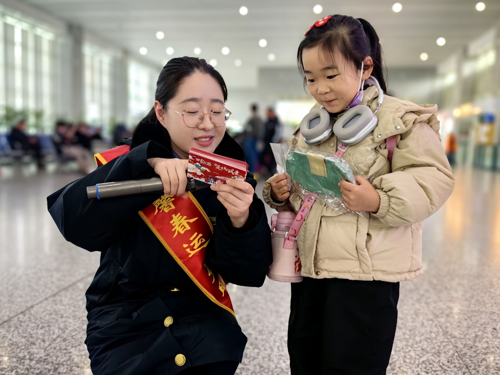 鐵路“小甜橙”志愿者在向小旅客宣傳春運注意事項。