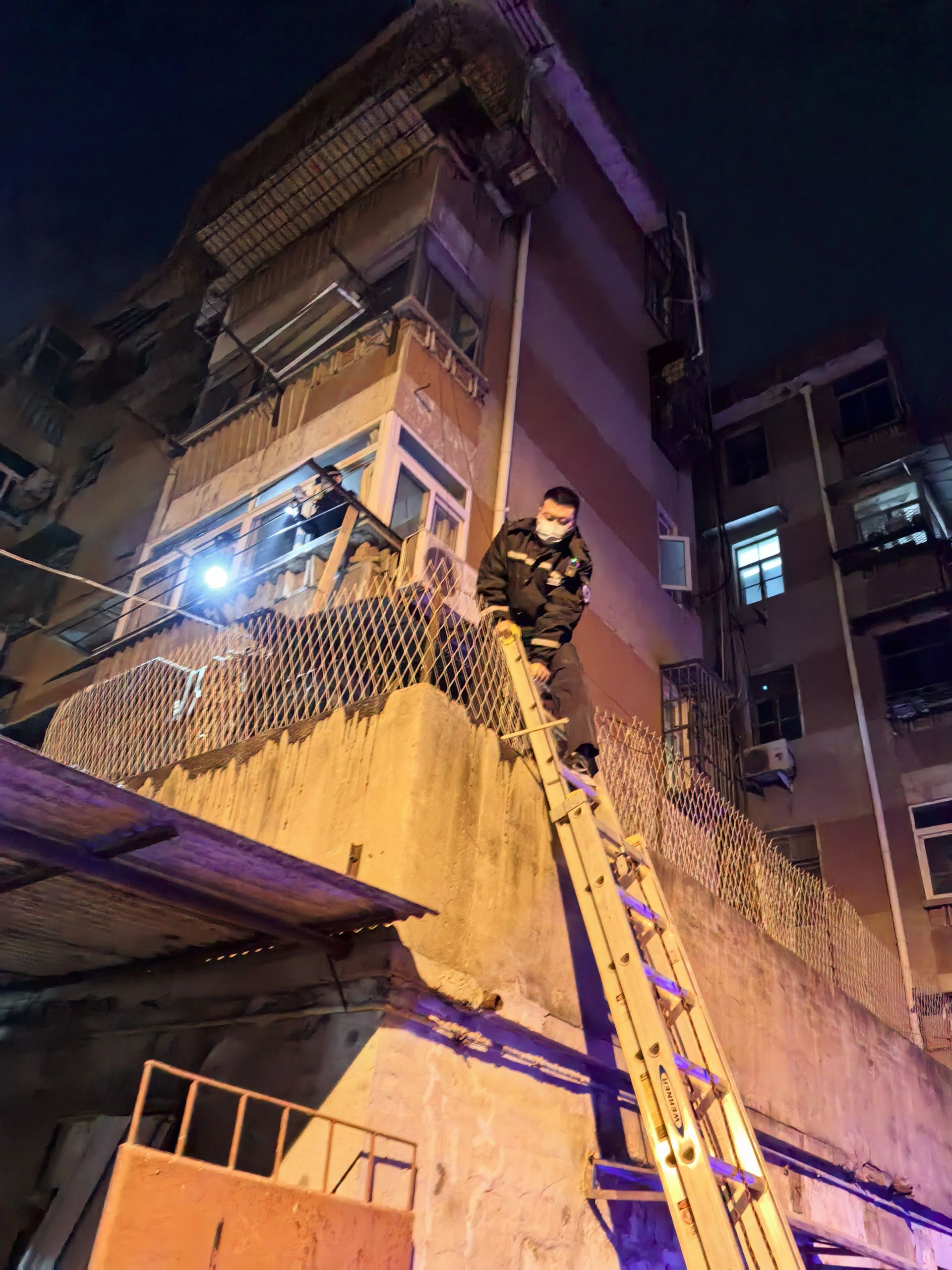 19時(shí)48分,120急救小組到達(dá)現(xiàn)場。這時(shí)他們才發(fā)現(xiàn),老人被困在陽臺(tái)外延的二樓平臺(tái)上,平臺(tái)周圍加裝了鐵網(wǎng)圍欄,無法翻越。劉燦必須攀爬到三樓的高度,大約七米,才能翻越進(jìn)入二樓平臺(tái)。