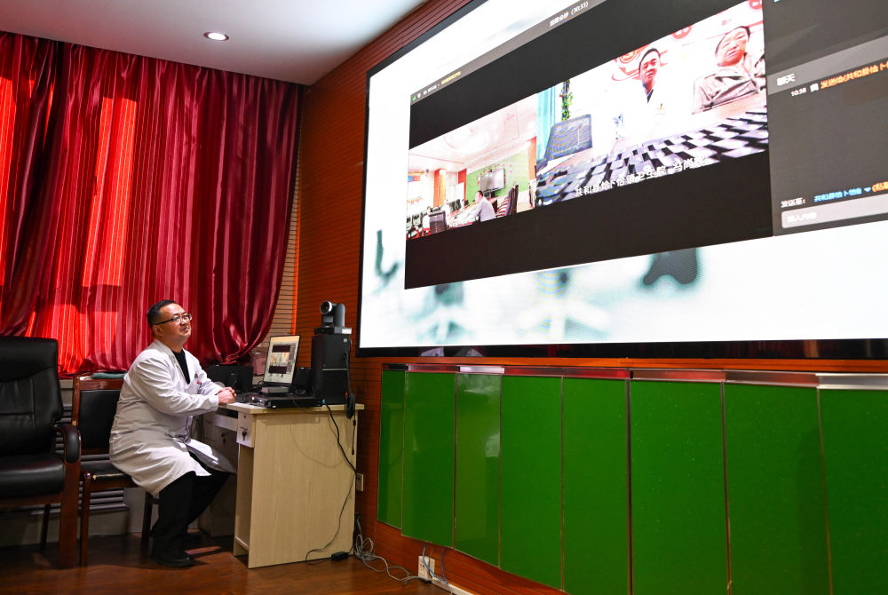 ??2024年12月17日,在青海省海南藏族自治州共和縣中醫(yī)院,醫(yī)生與鄉(xiāng)鎮(zhèn)衛(wèi)生院連線進(jìn)行遠(yuǎn)程會(huì)診。新華社記者 張龍 攝