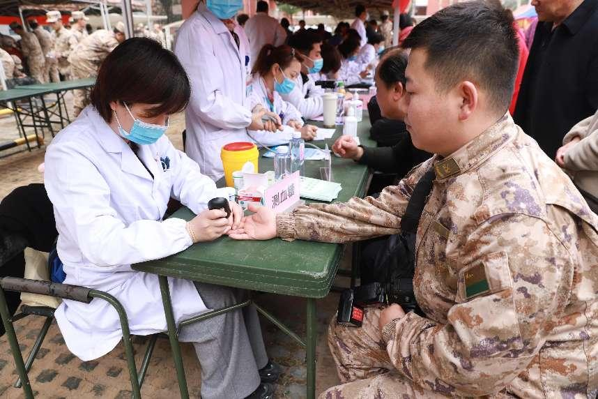 活動現場,前來咨詢和檢查的官兵及家屬排起長隊。來自市中心醫院的呼吸內科、中西醫科、消化內科、老年醫學科、骨科、急診外科、皮膚科、眼科、兒科、藥學部、影像科、超聲科、心電圖、護理部等科室的專家團隊認真聽診問詢,耐心解答疑問,免費發放藥品并進行用藥指導,認真測量血壓、血糖、血型,詳細詢問病情病史,仔細解讀影像資料,依據病情給出專業的治療建議,并對提出的關于日常訓練中遇到的運動損傷等問題也進行了耐心答疑。幫助他們提高自我防護意識。義診現場還提供免費的CT、超聲、心電圖檢查,發放健康宣傳冊等,受到部隊官兵及家屬一致好評。
