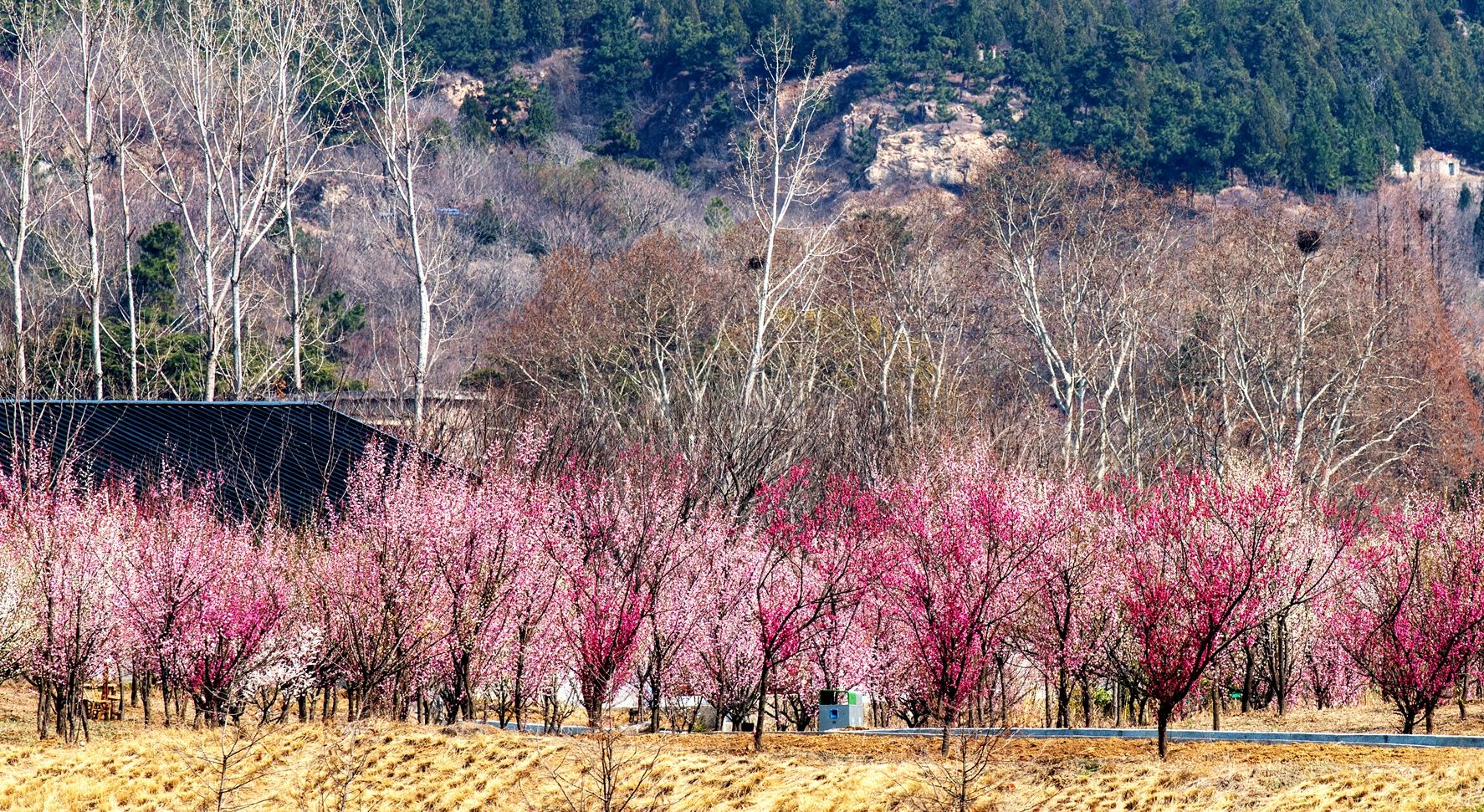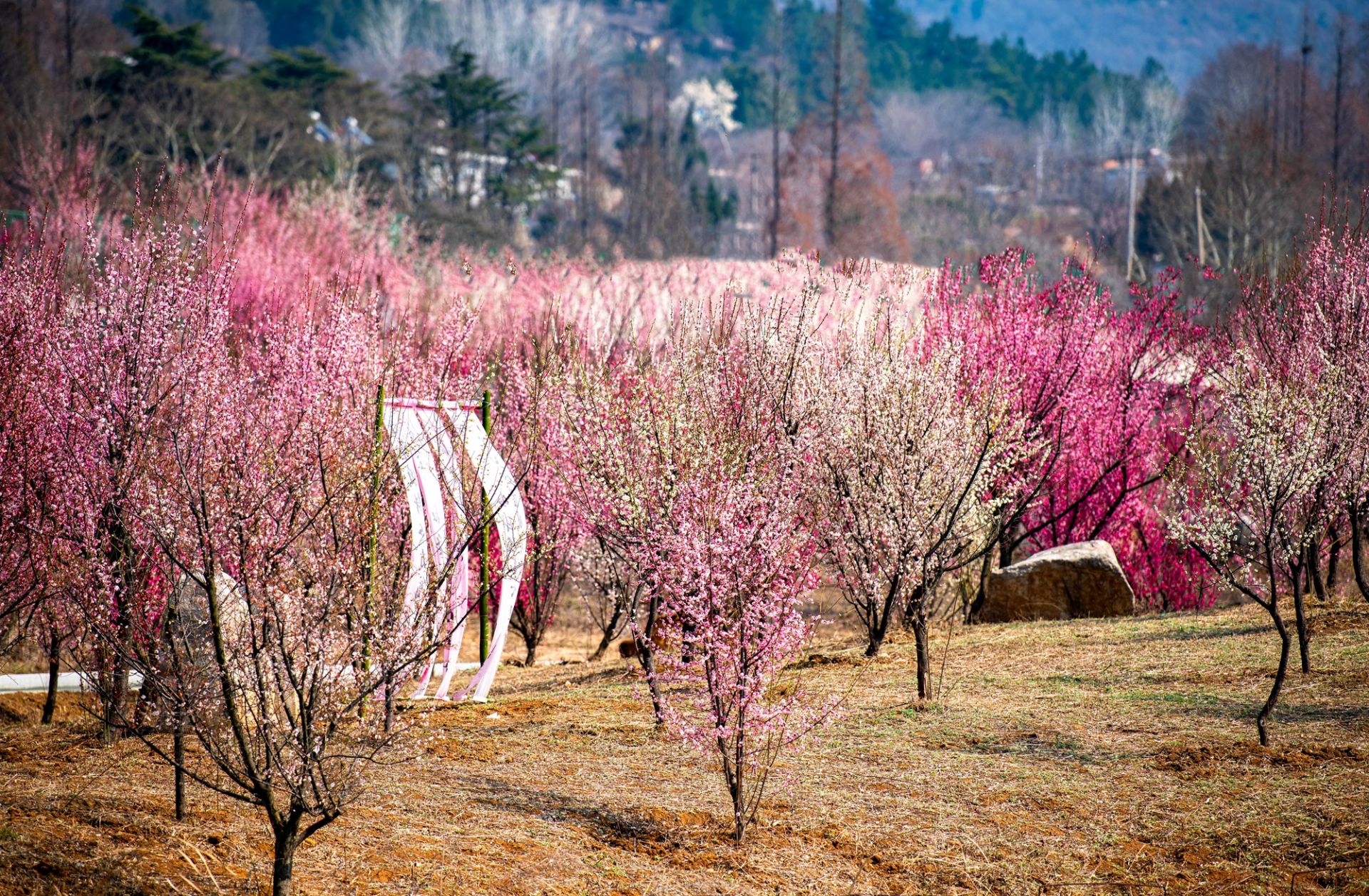 春日,安徽省蚌埠市禾泉小鎮內的梅園,大片大片的梅花肆意綻放,紅的似火,粉的如霞,白得像雪,層層疊疊交相輝映。游園的人們沉醉在這梅的世界。