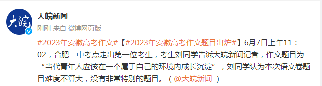 6月7日上午11:02,合肥二中考點走出第一位考生,考生劉同學告訴大皖新聞記者,作文題目為“當代青年人應該在一個屬于自己的環境內成長沉淀”,劉同學認為本次語文卷題目難度不算大,沒有非常特別的題目。