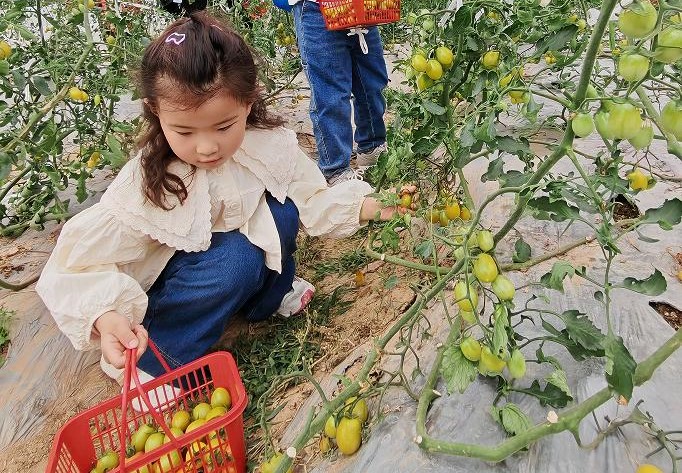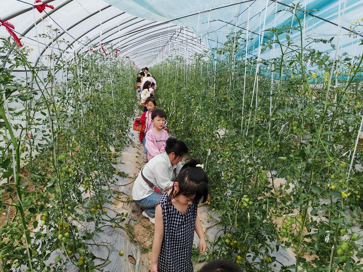 清明過后,田野一片綠色,油菜花尚未落盡,孩子們對田野的一草一木都十分新奇。在老師和家長的陪同下,一個個走進大棚內,看到色彩各異的小番茄,更是興奮,不一會兒,小籃子里就裝滿了紅的、綠的、紫的金珠番茄。