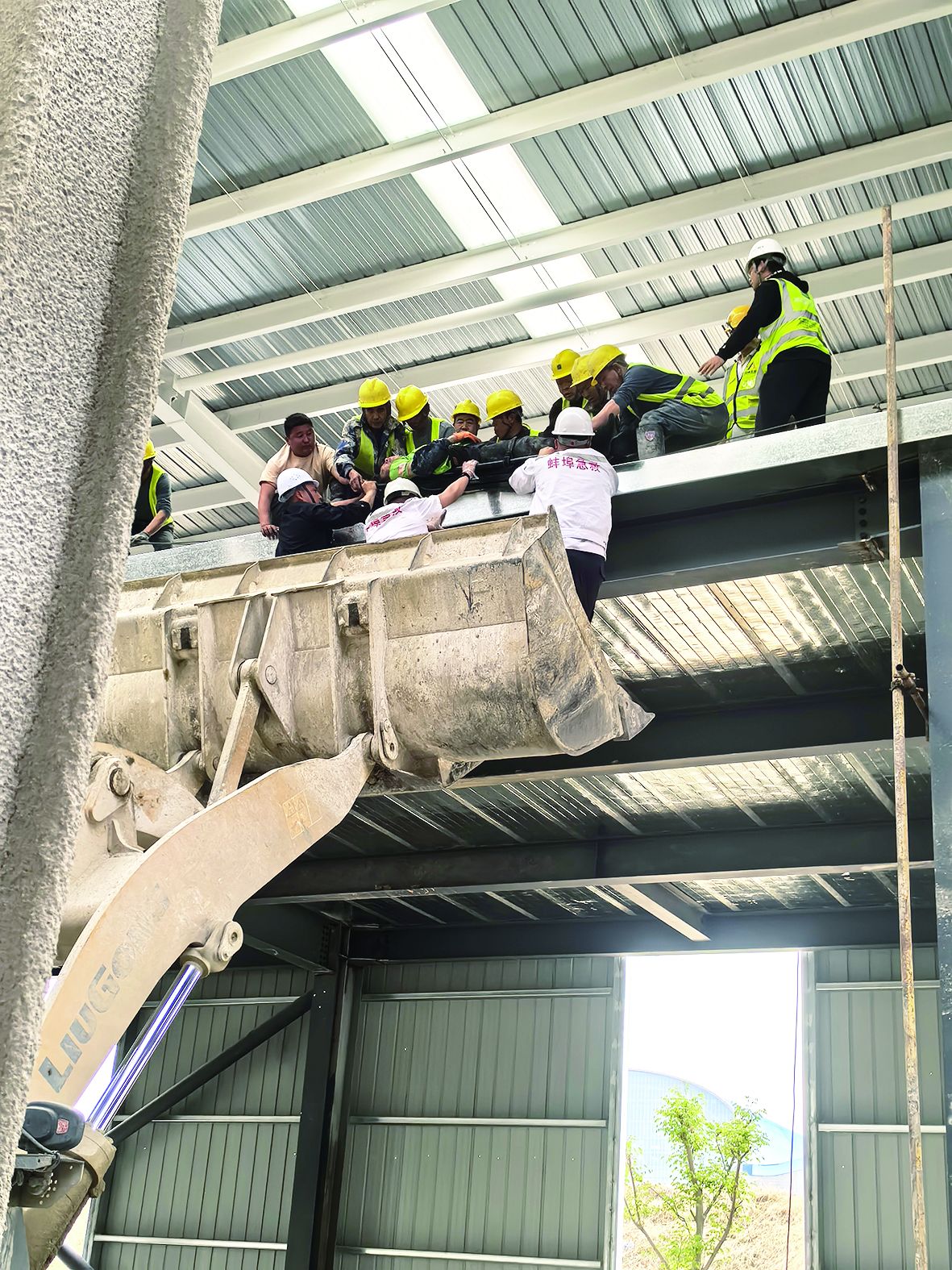 在確保傷者穩定后,急救人員與工友們合力將其平移至挖掘機鏟斗內。隨后,挖掘機小心翼翼地將載有傷者和急救人員的鏟斗降回地面。