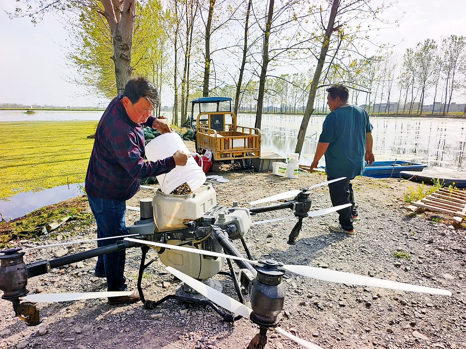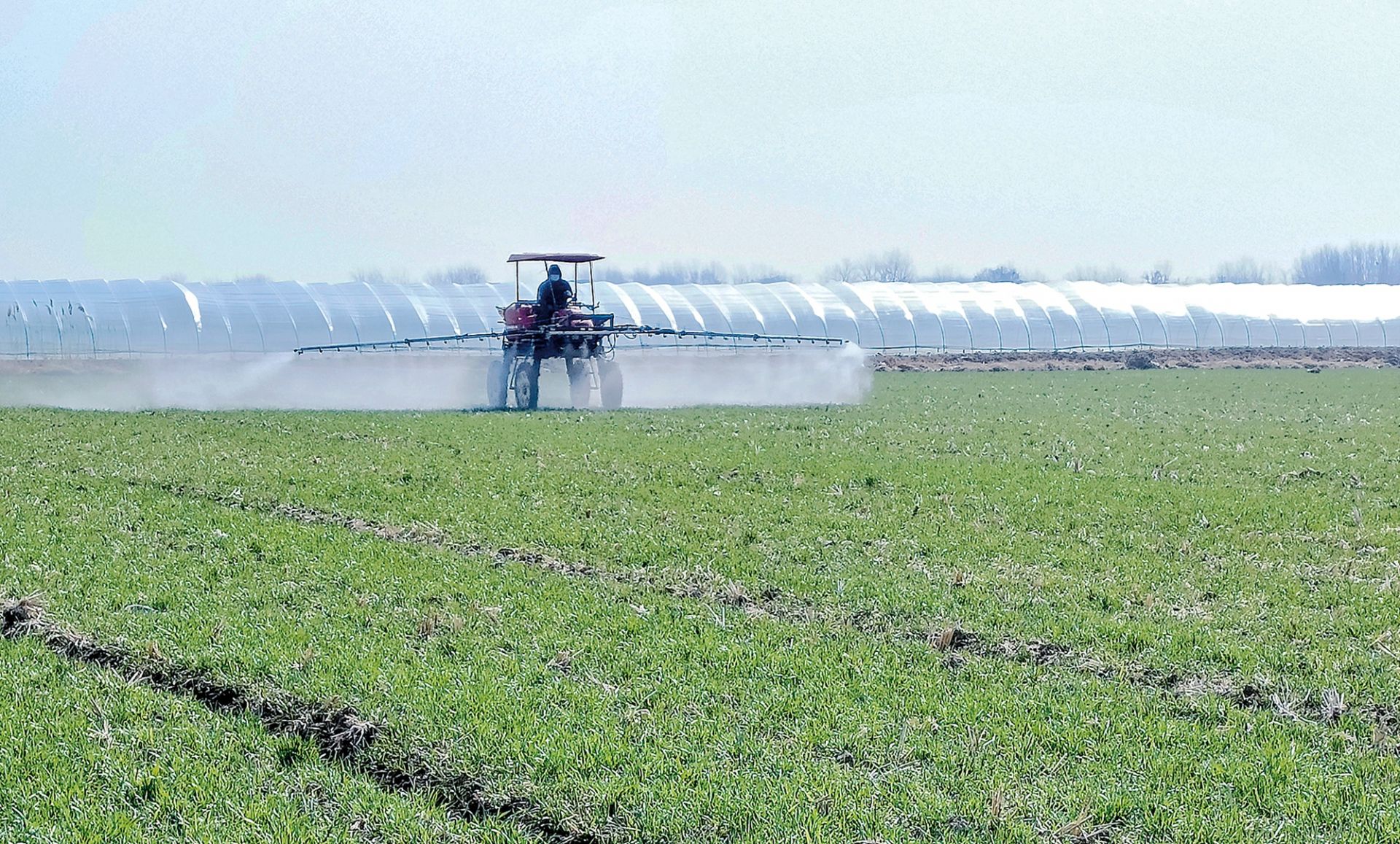 梅橋鎮種植大戶劉松利用無人機和機械進行“一噴三防”,預防小麥白粉病、蟲害、倒伏。