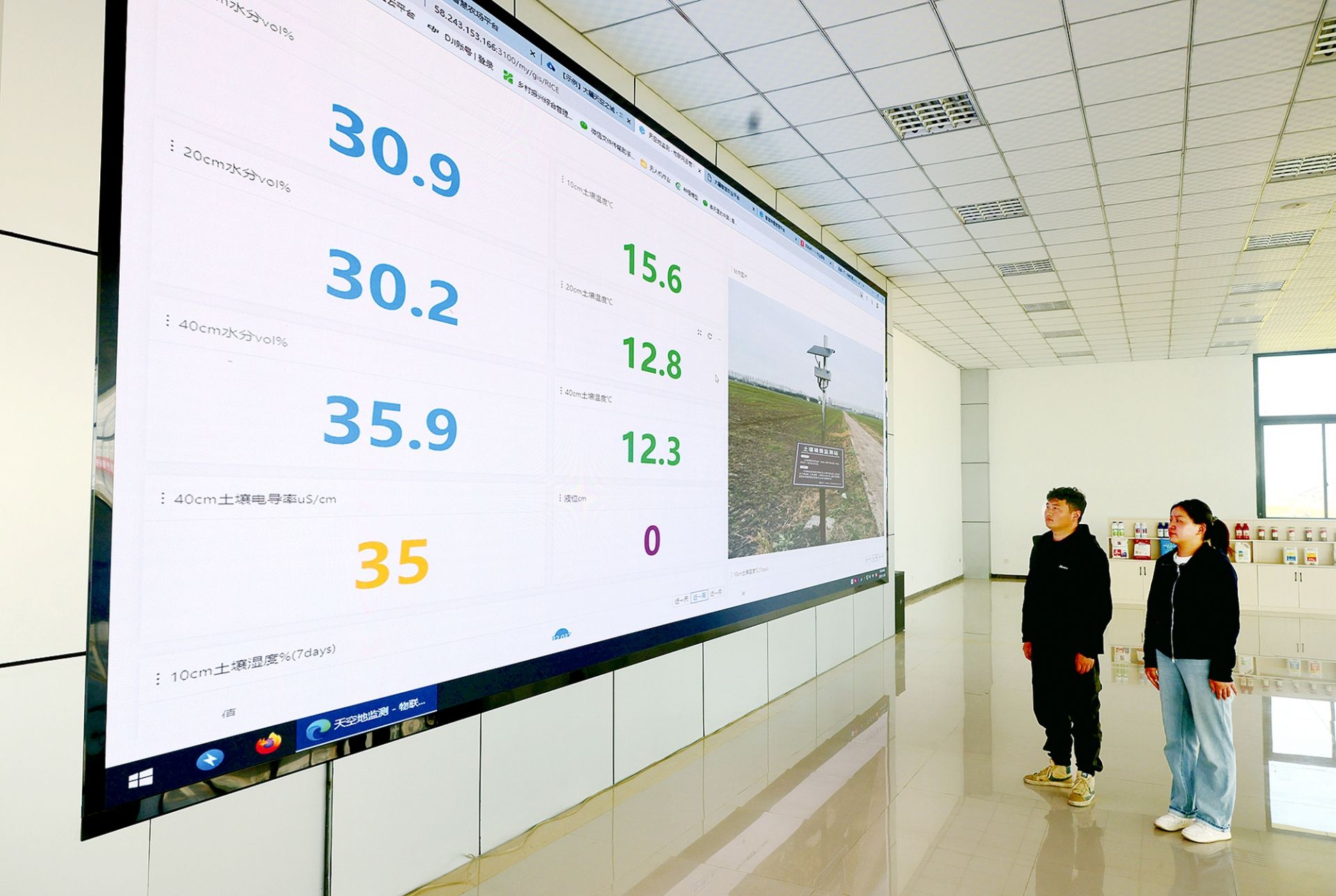 4月2日,安徽農墾龍亢農場工作人員通過大屏幕了解田間設施反饋的監測數據。