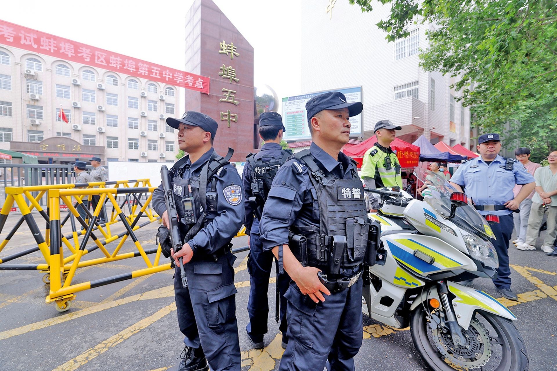 6月7日,五中考點(diǎn),特警、民警和交警為高考保駕護(hù)航。