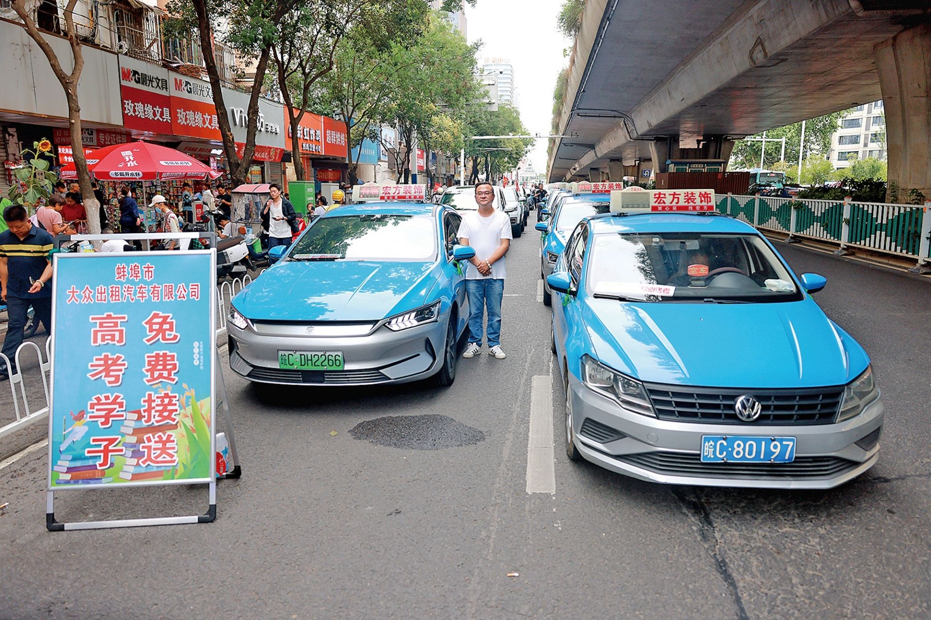 6月7日,蚌埠一中考點(diǎn),免費(fèi)接送高考學(xué)子的出租車。