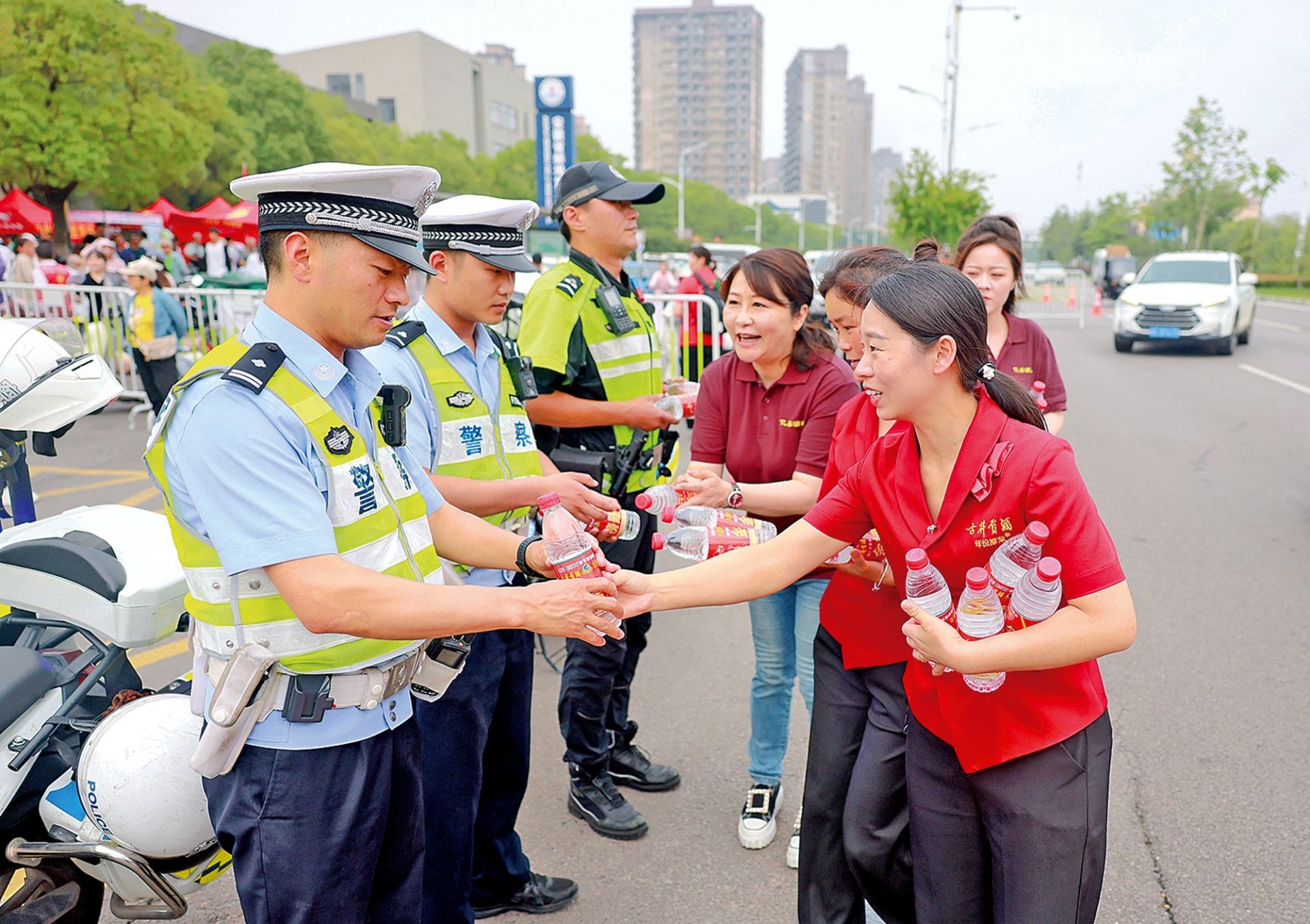 6月8日,志愿者為考點(diǎn)周邊執(zhí)勤交警送上防暑降溫用品。(劉晨 陳昂)