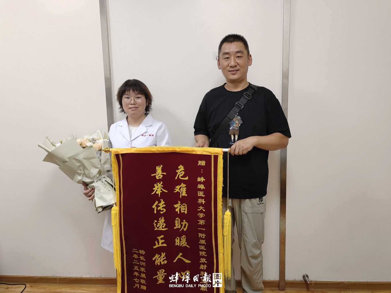7月27日,一面寫著 “危難相助暖人心,善舉傳遞正能量” 的錦旗,送到了蚌埠醫(yī)科大學第一附屬醫(yī)院放射科王穎手中。這面遲到52天的感謝,背后藏著一段發(fā)生在初夏的暖心故事。