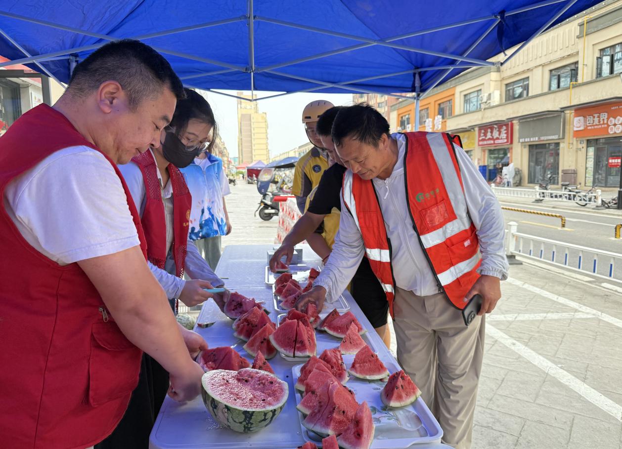 活動現場,社區工作人員早早就忙碌起來:搭起遮陽棚、擺放防暑物資……一份份裝有藿香正氣水、清涼油、毛巾等實用物品的清涼禮包整齊排列,與礦泉水共同筑起一座“愛心小山”。“來,師傅!這是您的清涼禮包,注意防暑。”工作人員一邊遞禮包,一邊關切的叮囑。剛切開的西瓜瓤紅汁多,香脆清甜,外賣小哥笑著說:“這西瓜比空調還解暑!”環衛工人張阿姨捧著禮包說:“社區總惦記著我們,干活都更有勁了!”現場歡聲笑語不斷,勞動者們臉上洋溢的幸福笑容。