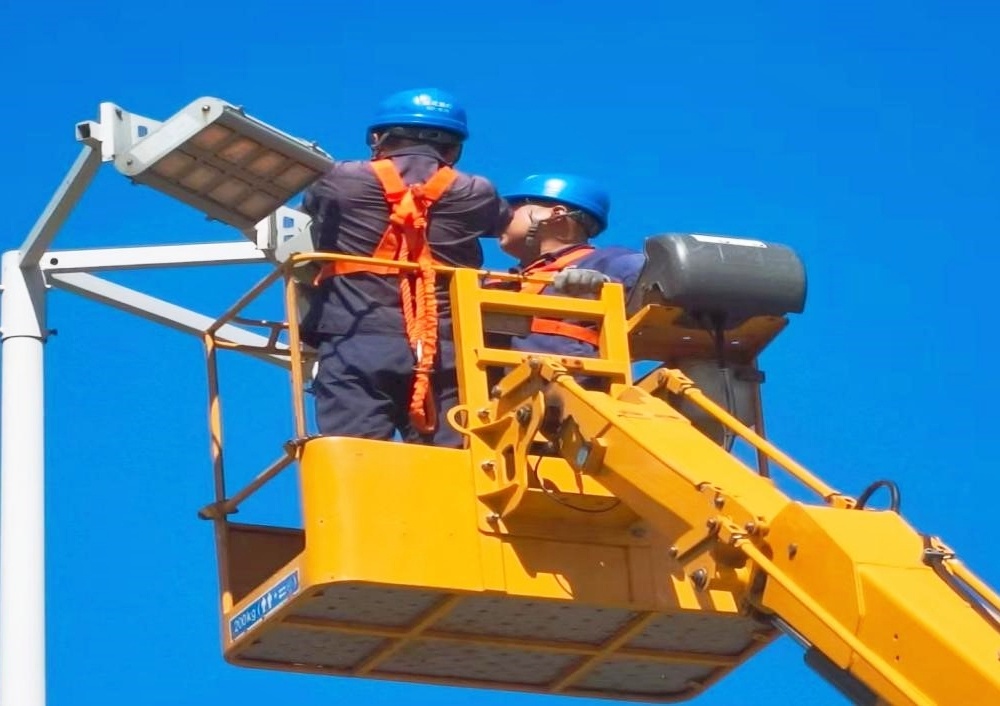 11:00,地表溫度接近50℃。路燈維修工人高懸于熾熱的燈桿旁,汗珠模糊視線,卻仍精準(zhǔn)排查故障、迅速修復(fù)調(diào)試,確保每盞路燈如期點(diǎn)亮夜色。