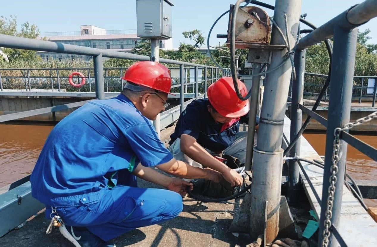 14:30,蚌埠市第一污水處理廠氧化溝旁,電工師傅正緊急搶修推流器——污水處理的關(guān)鍵設(shè)備。陽(yáng)光直射、高溫蒸灼,他們爭(zhēng)分奪秒排除故障、更換零件,筑牢高溫下的環(huán)保防線。