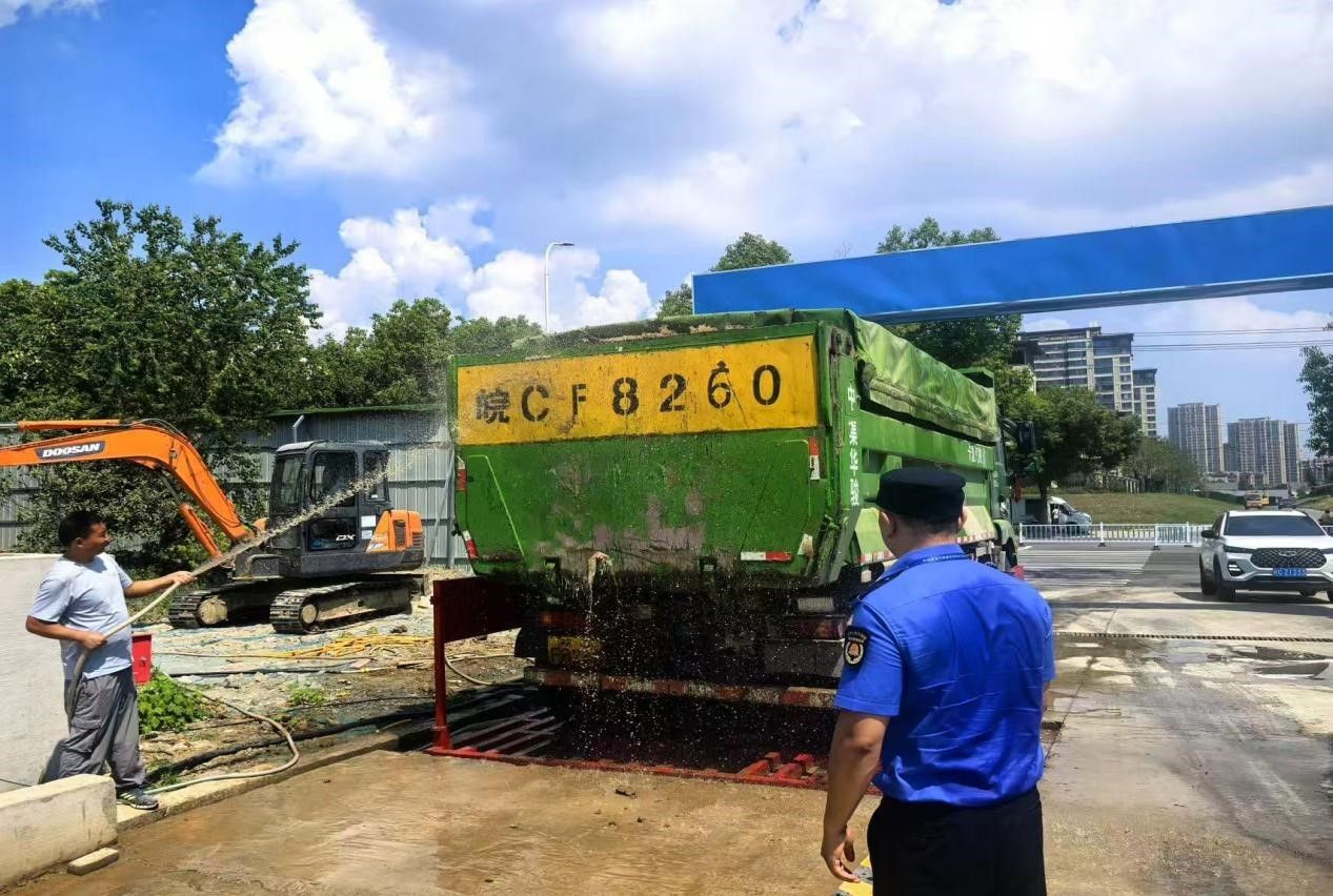 15:00,蚌埠市固體廢棄物管理中心城管執(zhí)法隊(duì)員在高溫中專注渣土作業(yè)檢查,從嚴(yán)把控“密閉運(yùn)輸、凈車出場(chǎng)”等環(huán)節(jié)。汗水浸透衣襟,執(zhí)著守護(hù)市容。