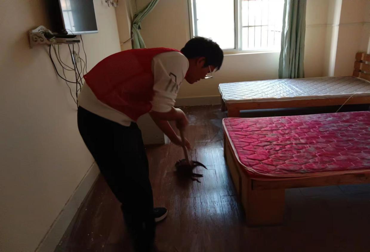 在社區(qū)志愿者的帶領(lǐng)下,大家手拿衛(wèi)生工具來到二樓各個房間和功能室,各自分工,干得熱火朝天。在師生和志愿者們的努力下,老人們的活動場地和居住環(huán)境變得更加干凈和整潔。打掃結(jié)束后,同學們還為敬老院的爺爺奶奶捶背、剪指甲,和他們聊天,老人們的臉上都洋溢著幸福的笑容。