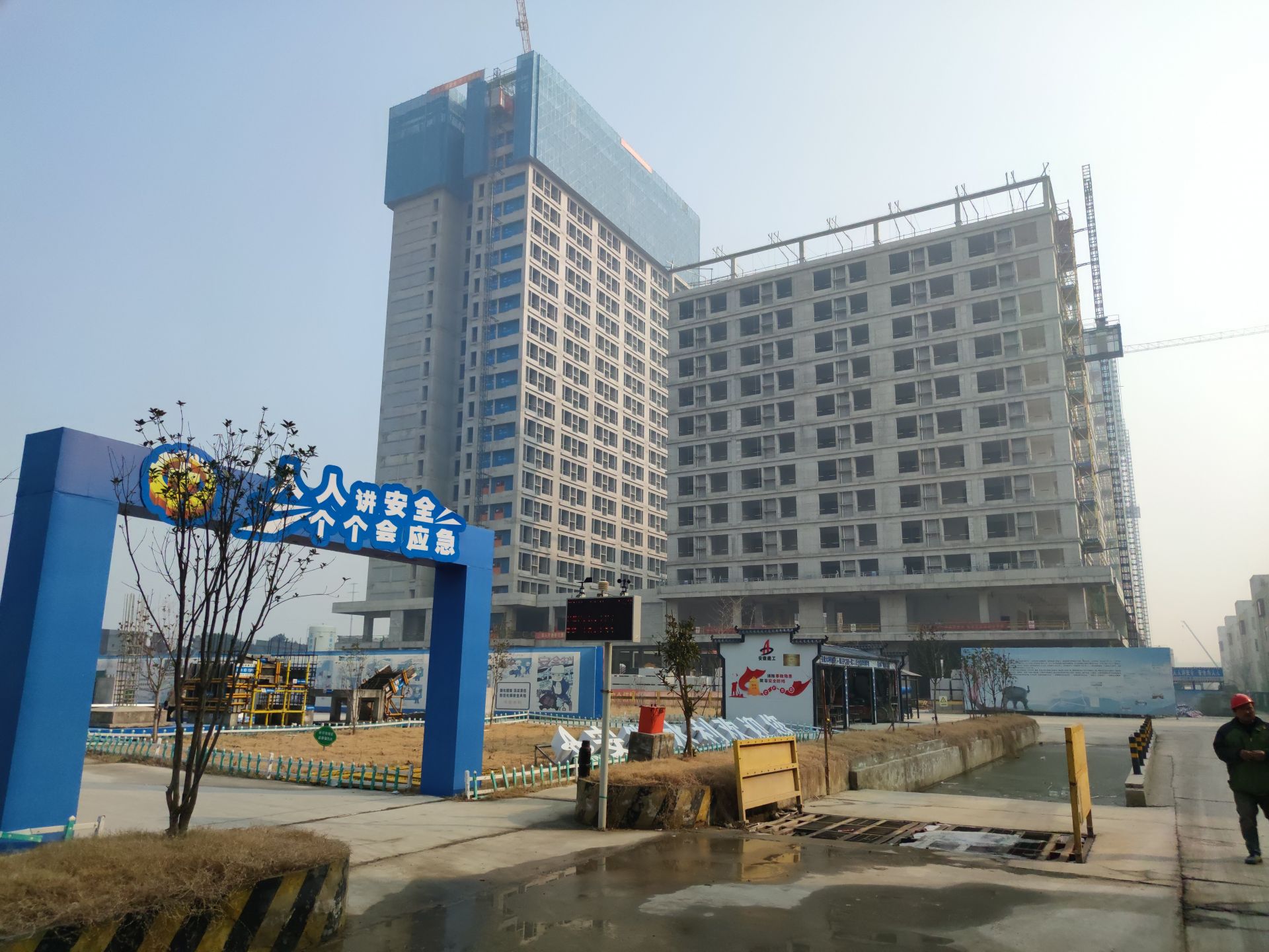 記者在施工現(xiàn)場看到,工人們正在緊鑼密鼓地進行樓體內(nèi)部的墻體砌筑施工和其他裝飾工程?!皞鞲泄裙㈨椖磕壳?個單體已經(jīng)全部封頂,主體結構已經(jīng)全部完成,現(xiàn)場正在進行外墻的幕墻施工,還有室內(nèi)墻體砌筑,以及室內(nèi)抹灰、地坪施工。室內(nèi)工程預計可在2024年8月份全面結束,之后我們將進行室外的配套工程施工?!笔┕挝簧a(chǎn)經(jīng)理張小強介紹,為了確保施工質(zhì)量和建設進度,施工單位在元旦假期期間安排了200多名工人進行現(xiàn)場作業(yè)。