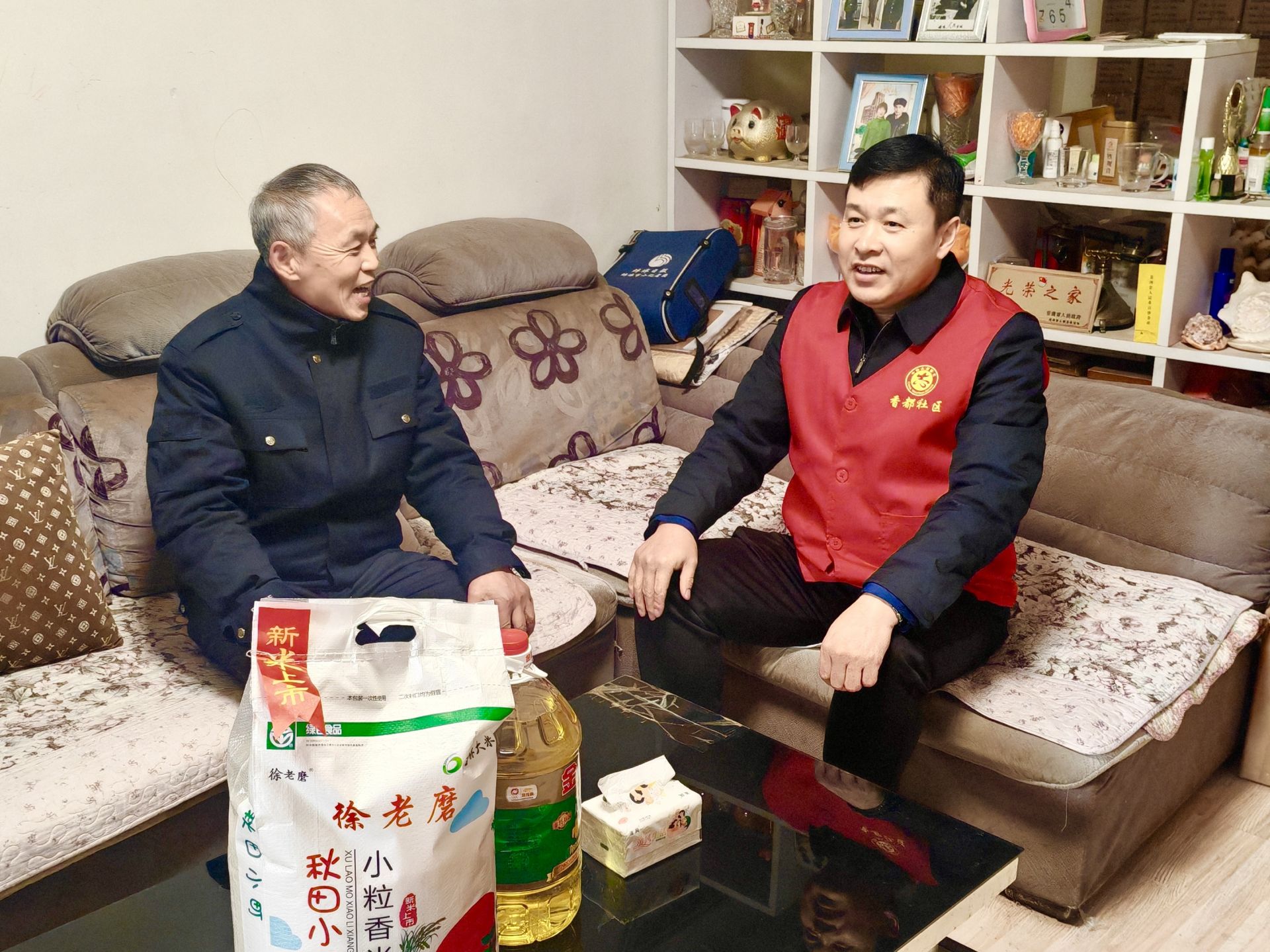 1月10日下午,社區志愿者、安徽省模范退役軍人馬志強(右)帶著慰問品走進香都社區新時代文明實踐站,慰問幫扶轄區3戶困難黨員、群眾,了解詢問家庭生活情況,并送去了大米、食用油等生活用品,以實際行動獻上愛心和溫暖。