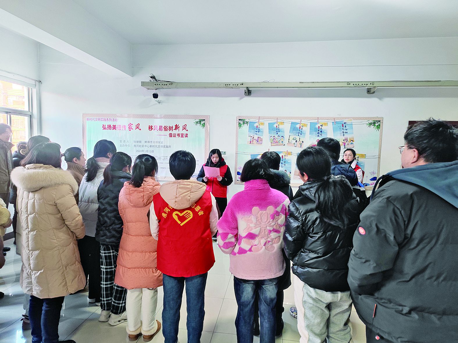 近日,淮河社區(qū)中心新時(shí)代文明實(shí)踐所開展“弘揚(yáng)美德傳家風(fēng) 移風(fēng)易俗樹新風(fēng)”倡議書宣讀活動(dòng),號(hào)召居民摒棄陳規(guī)陋俗,樹立文明理念,踐行移風(fēng)易俗,爭做良好家風(fēng)的傳承者、踐行者。 劉翠華 攝