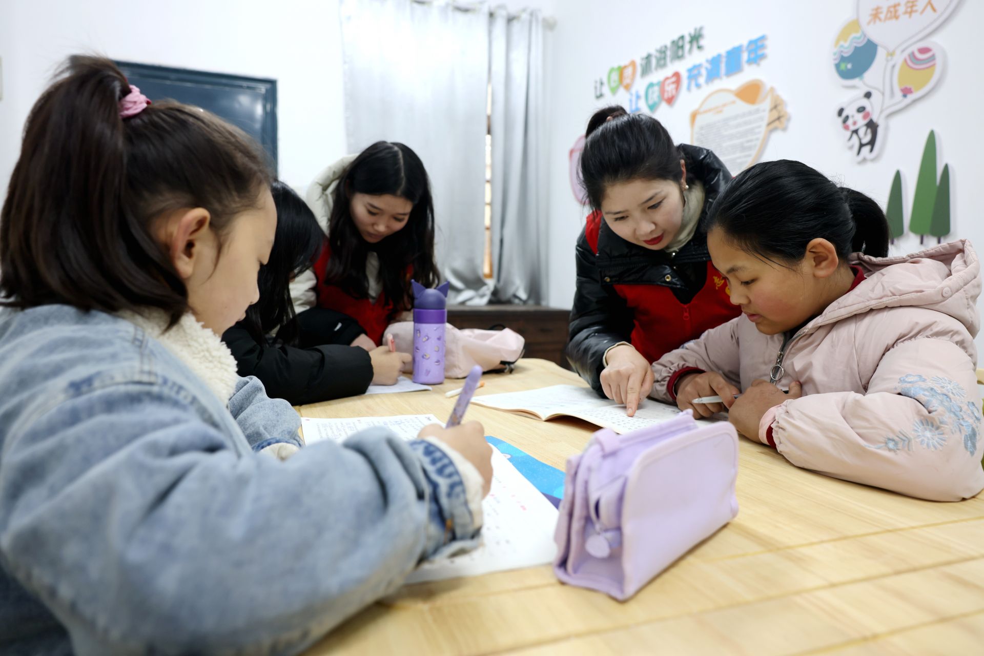 1月30日,治淮街道未成年人保護站,光明街社區大學生志愿者在輔導學生功課。
