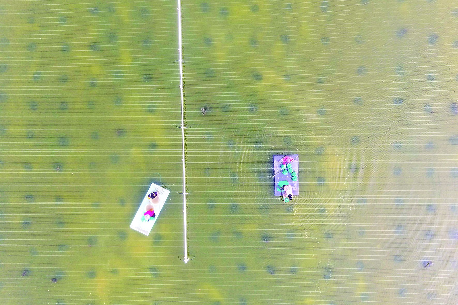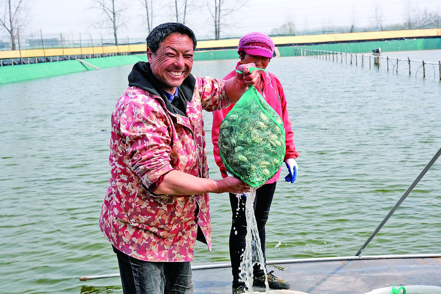 3月10日,在五河縣申集鎮,蟹農在投放蟹苗。連日來,五河縣螃蟹養殖戶搶抓晴好天氣共向萬畝水產養殖基地投放了一千萬只蟹苗,呈現出一幅水上“春耕”圖。