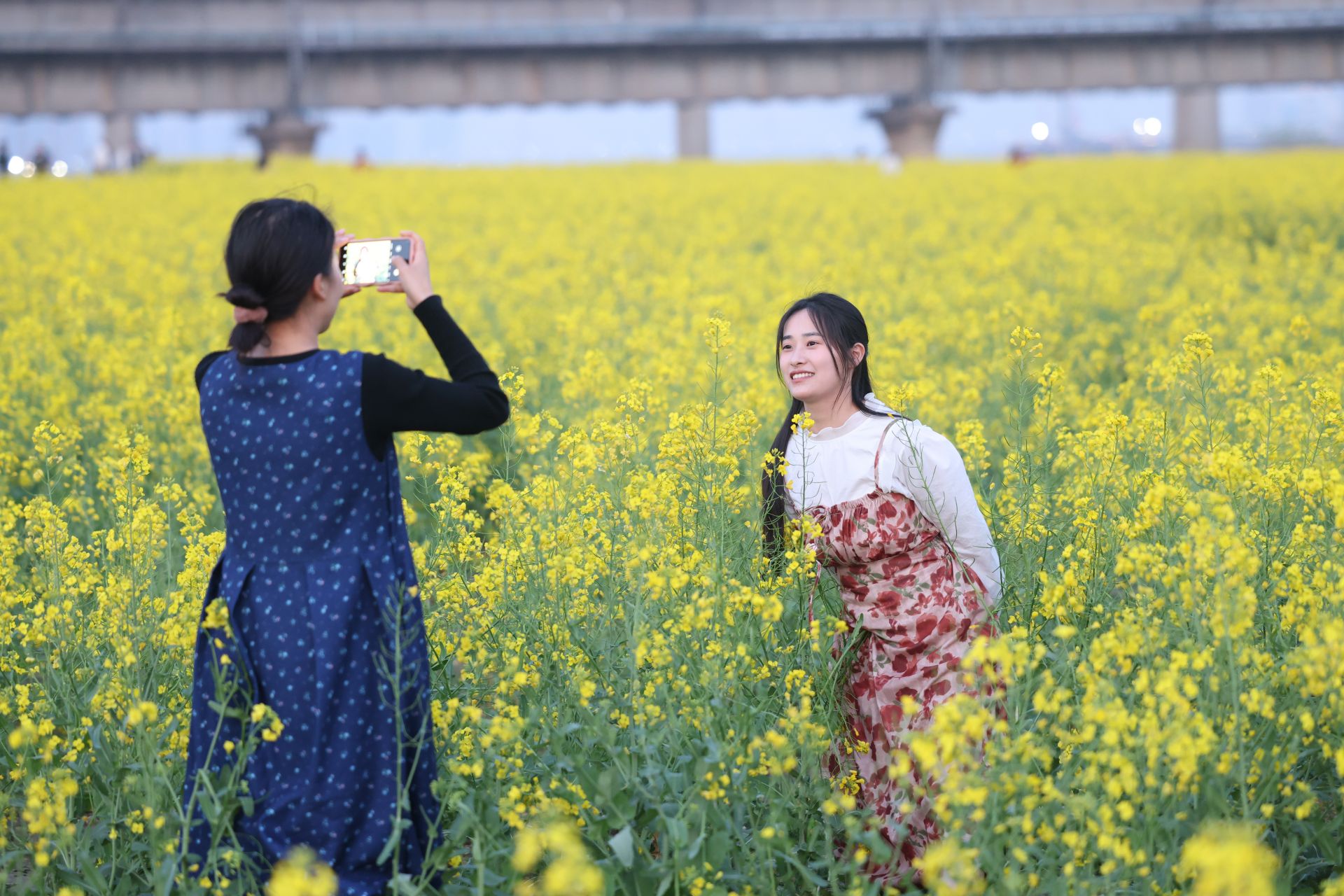 靚淮河北岸淮河大鐵橋下油菜花盛開,吸引市民前來打卡。