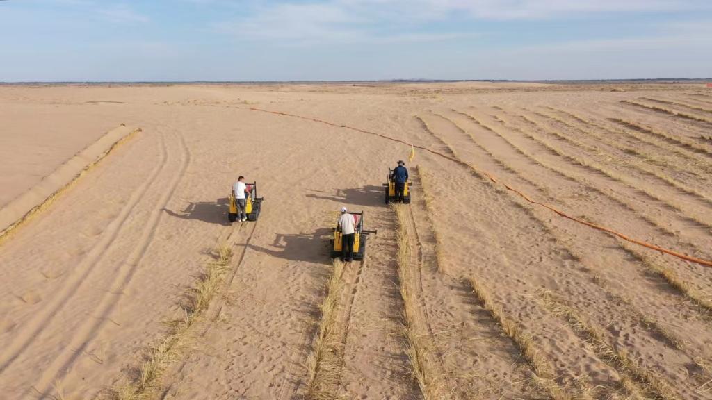 在內蒙古巴彥淖爾市烏拉特后旗西補隆林業管護中心,4臺裝有履帶的壓沙機正在沙地里“插秧”——小推車大小的壓沙機前方都裝有一個直徑80厘米的大齒輪,壓沙機前進一米,大齒輪就會將早已均勻鋪在沙地上的稻草、秸稈精準“植”入沙地里。不一會兒,一條條金黃色的沙障“編織”完成,將沙丘牢牢縛住。