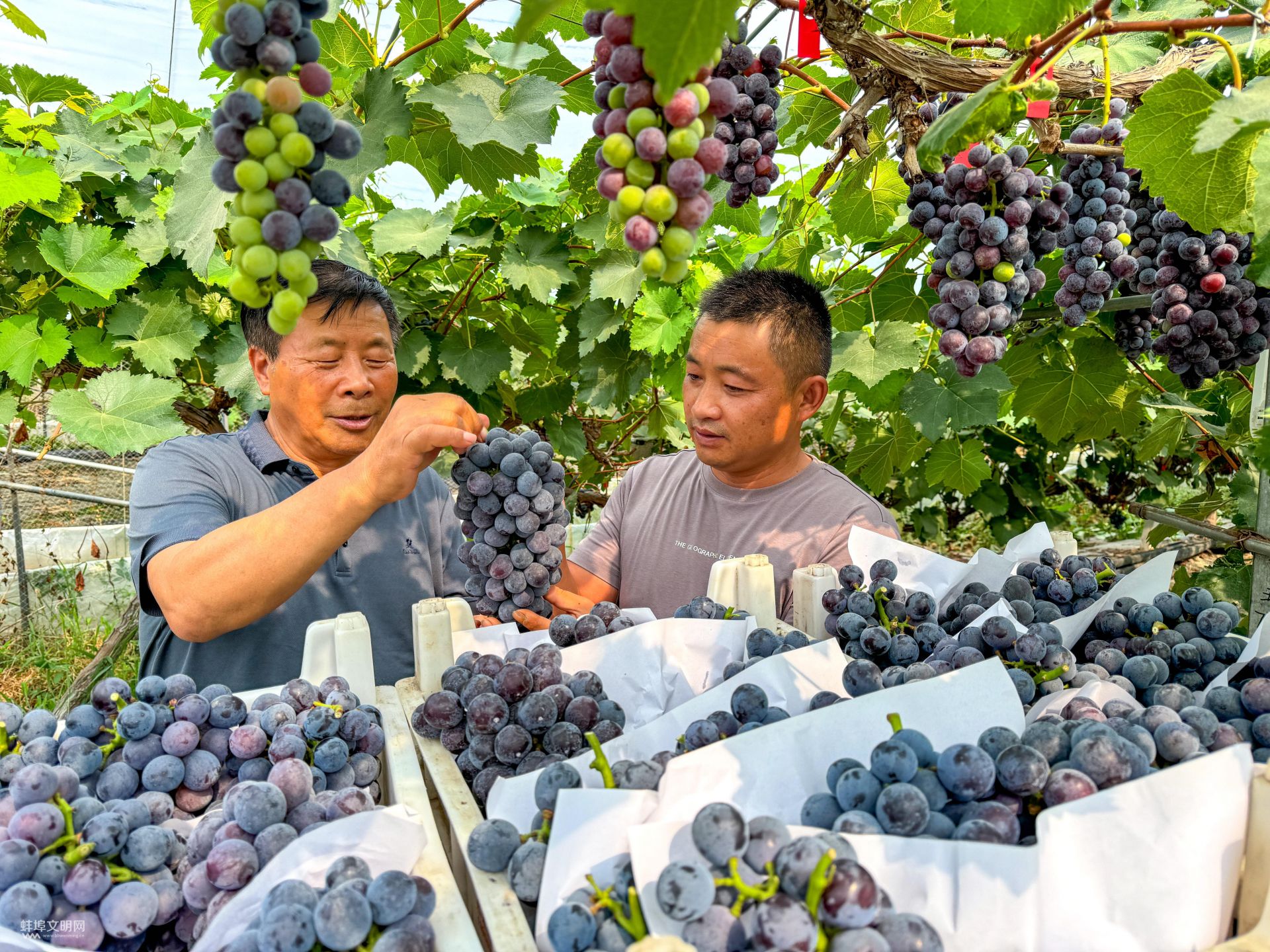 淮上區(qū)九禾生態(tài)園項目(安徽九禾農(nóng)業(yè)發(fā)展有限公司),負(fù)責(zé)人范云柳(左)與種植戶王俊查看葡萄品質(zhì)。