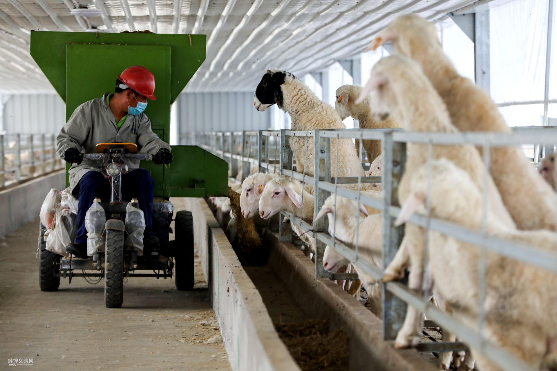 固鎮(zhèn)縣畜光互補湖羊養(yǎng)殖幫扶基地(安徽省爭華羊業(yè)集團(tuán)有限公司),工作人員正在使用專用車輛投喂飼料。