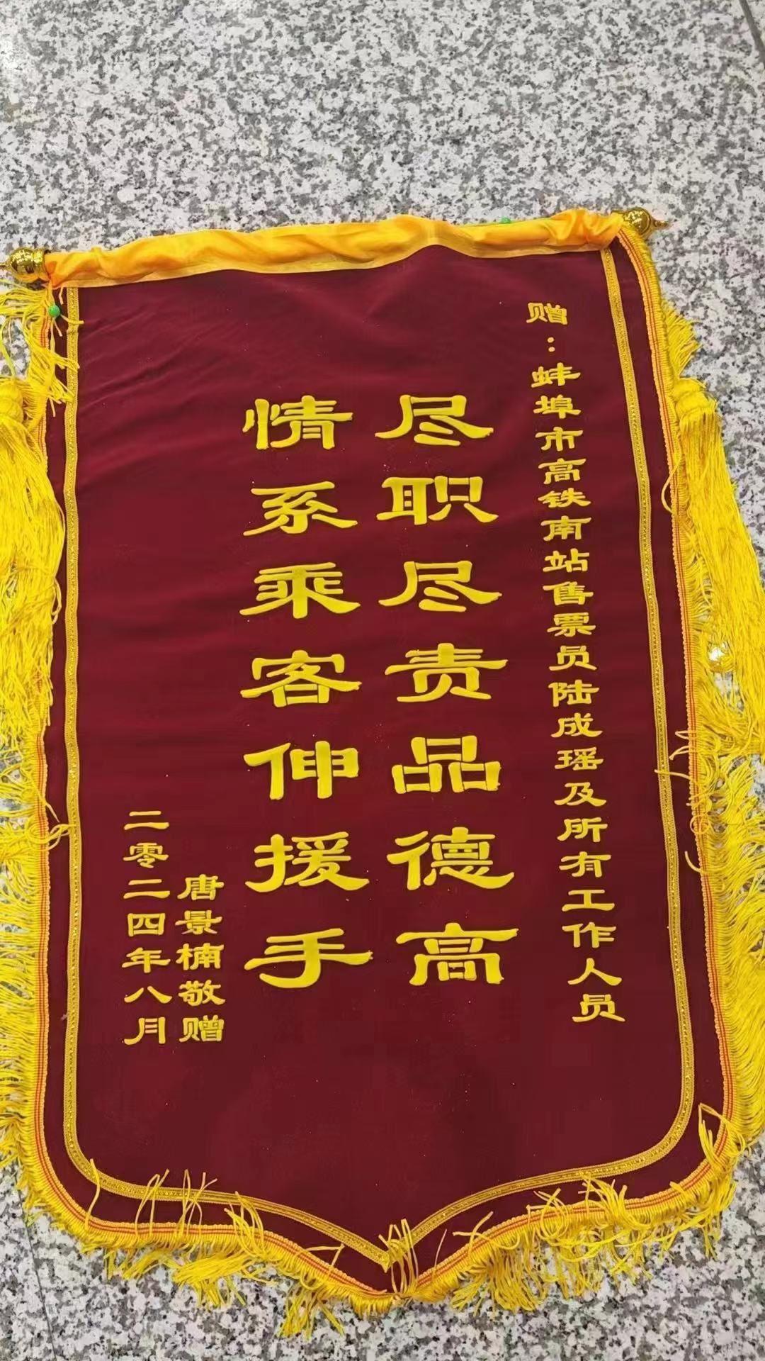 蚌埠文明網訊(融媒體記者 何沛 通訊員 馬銳超)8月25日,高鐵蚌埠南站“洪祥服務臺”收到一面寫有“盡職盡責品德高,情系乘客伸援手”的錦旗。