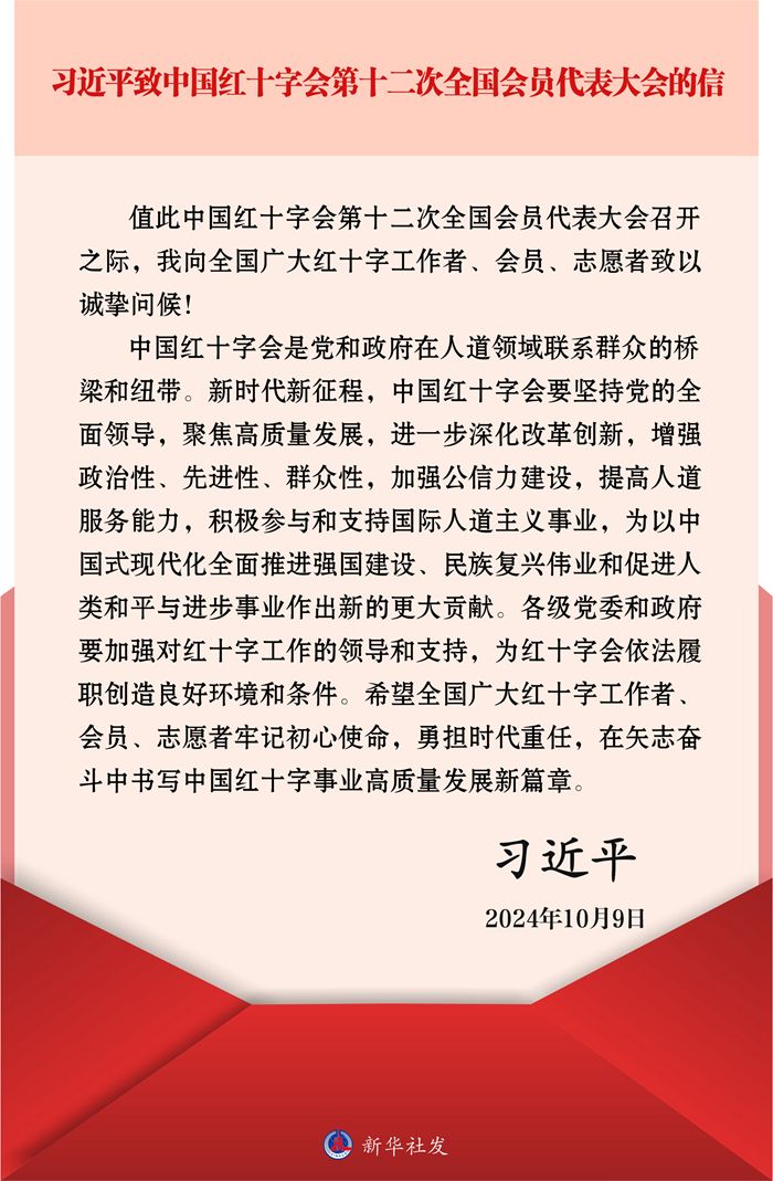 新華社北京10月9日電 在中國(guó)紅十字會(huì)第十二次全國(guó)會(huì)員代表大會(huì)召開(kāi)之際,中共中央總書記、國(guó)家主席、中央軍委主席習(xí)近平致信大會(huì),向全國(guó)廣大紅十字工作者、會(huì)員、志愿者致以誠(chéng)摯問(wèn)候,并對(duì)做好紅十字工作提出希望。