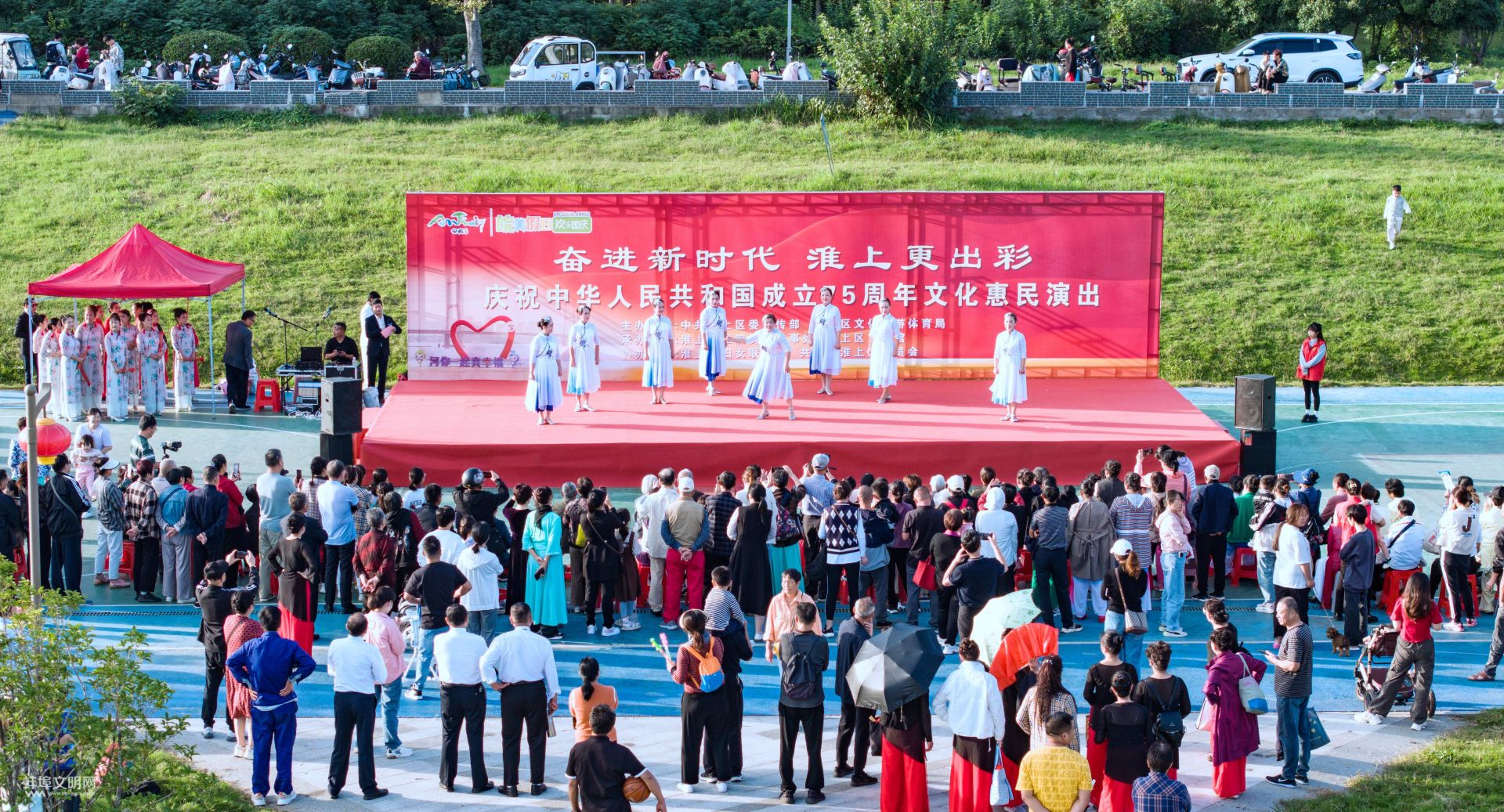淮上區(qū)主辦的慶祝中華人民共和國(guó)成立75周年文化惠民演出在“靚淮河”景區(qū)北岸上演,游客駐足觀看。