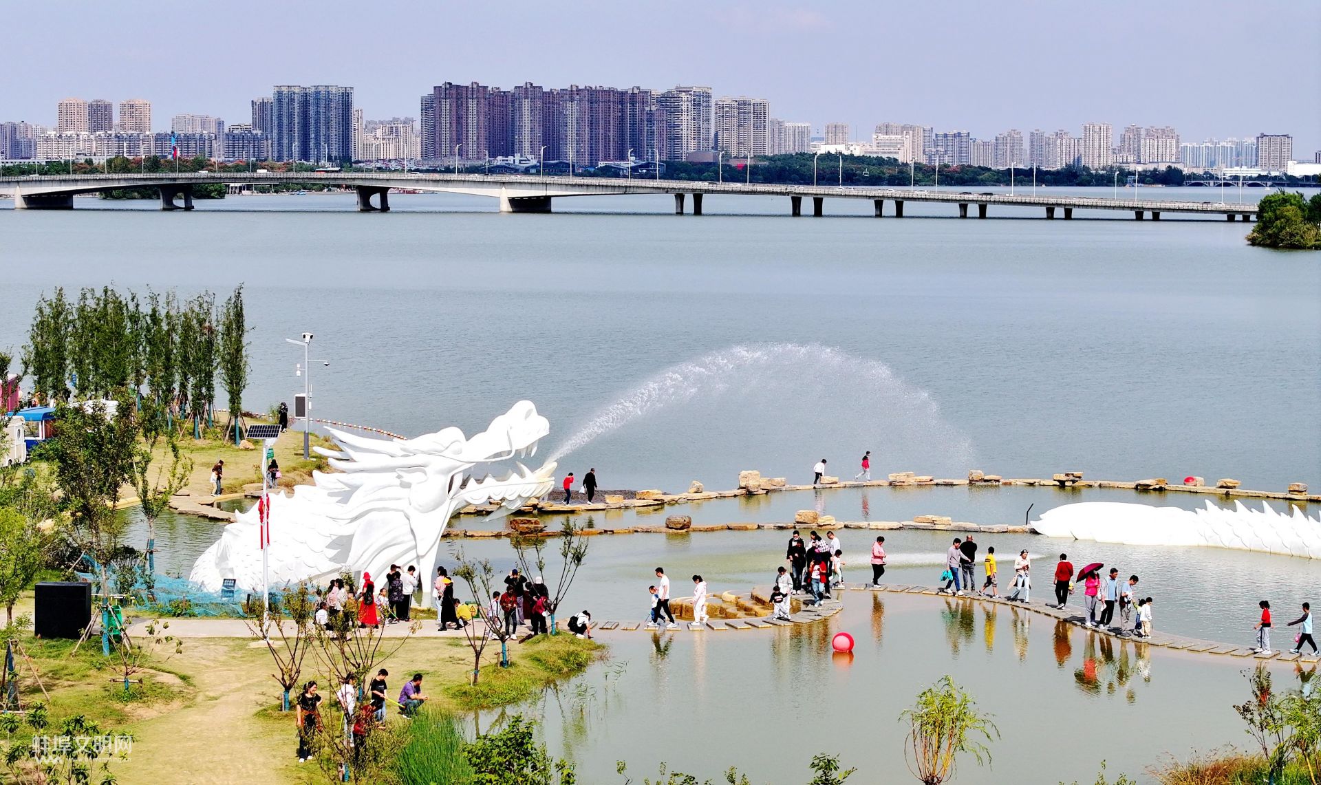 游客在位于龍子湖東岸的“國(guó)家級(jí)幸福河湖”項(xiàng)目現(xiàn)場(chǎng)游玩打卡。