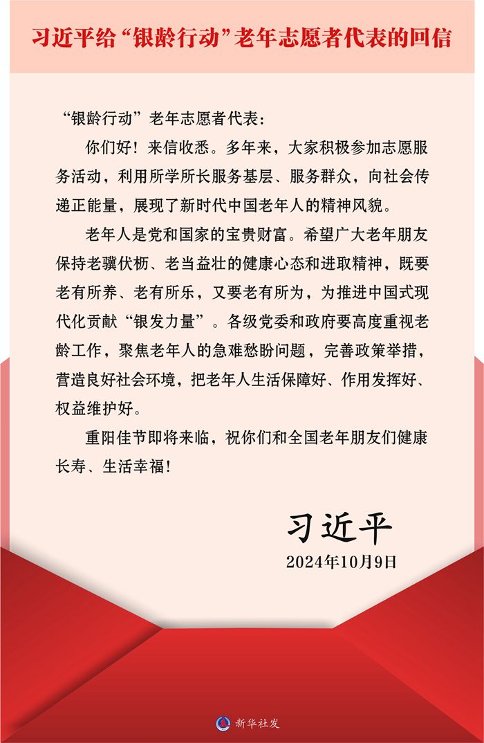 新華社北京10月10日電 在中華民族傳統(tǒng)節(jié)日重陽(yáng)節(jié)來(lái)臨之際,中共中央總書記、國(guó)家主席、中央軍委主席習(xí)近平給“銀齡行動(dòng)”老年志愿者代表回信,對(duì)他們予以親切勉勵(lì),向全國(guó)的老年人致以誠(chéng)摯問(wèn)候。