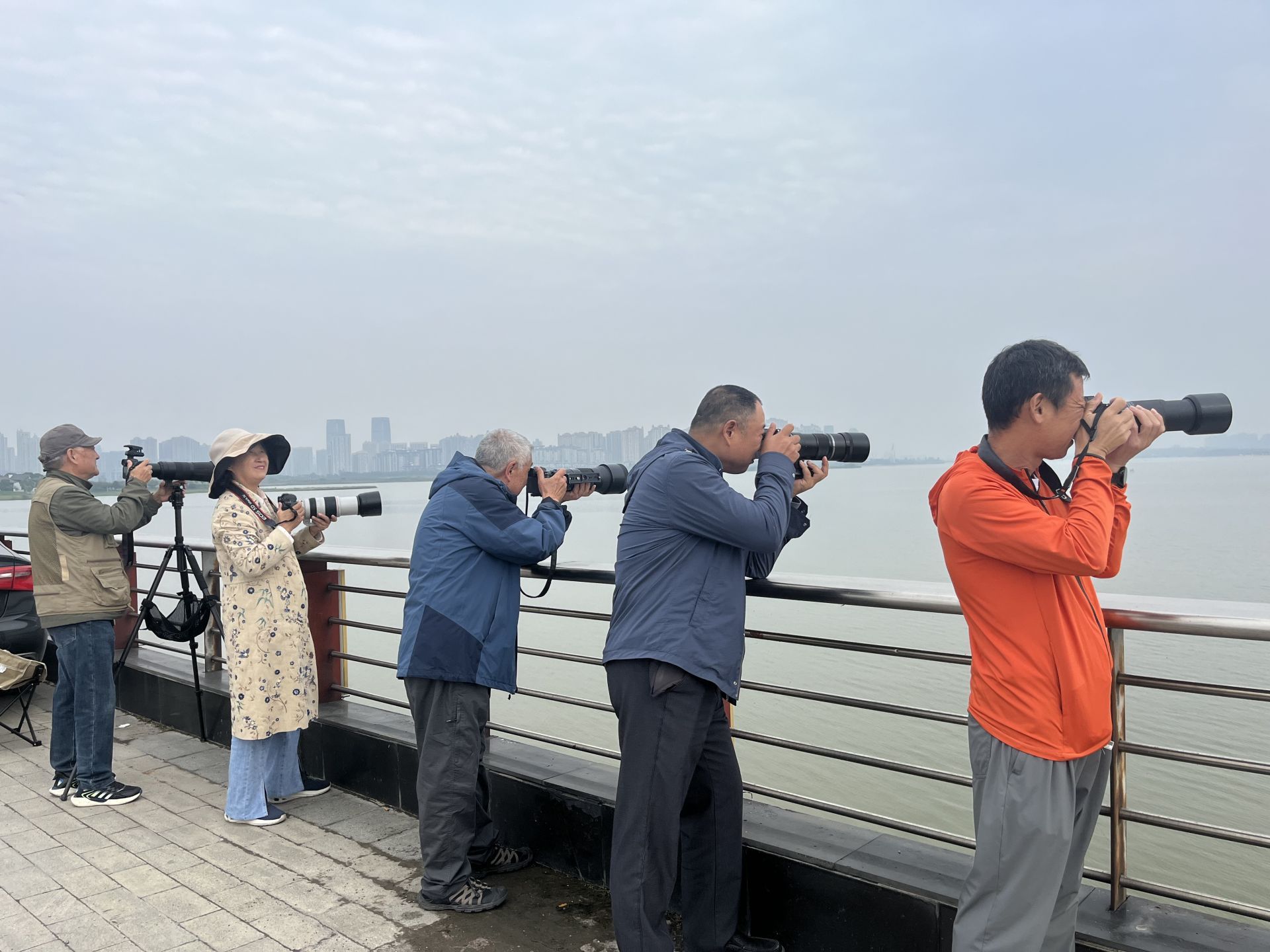 鳥類保護志愿者們在觀鳥、拍攝鳥類活動。